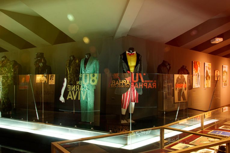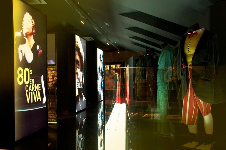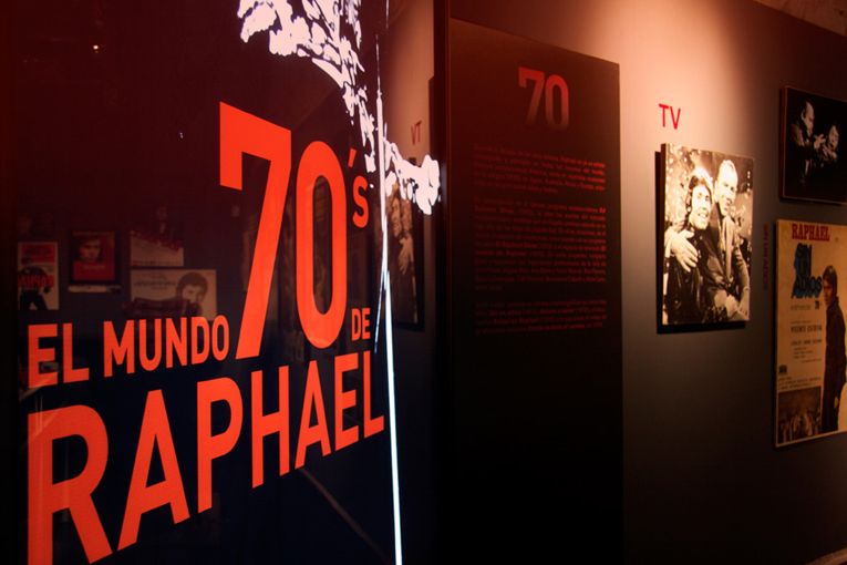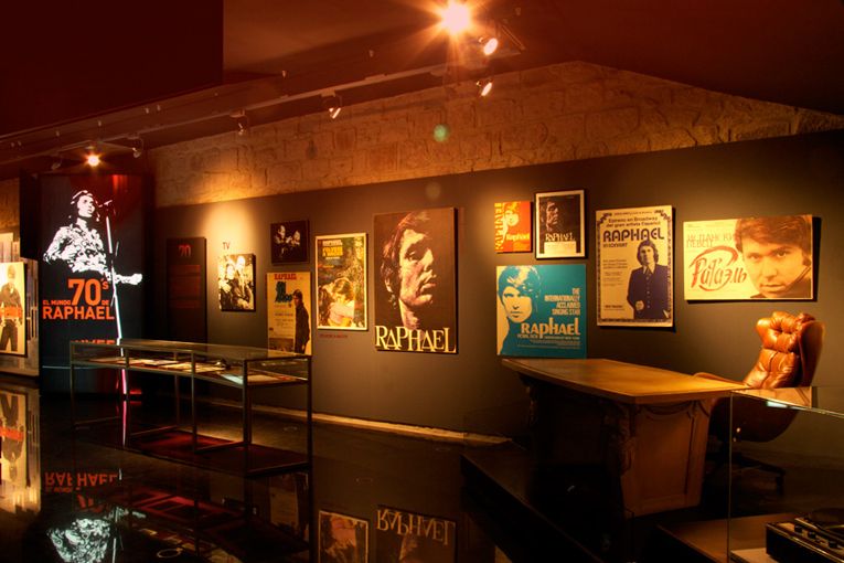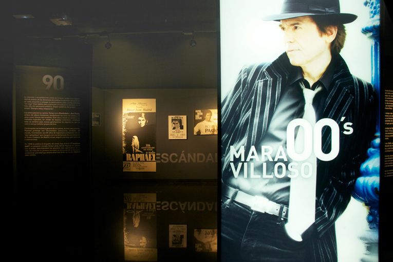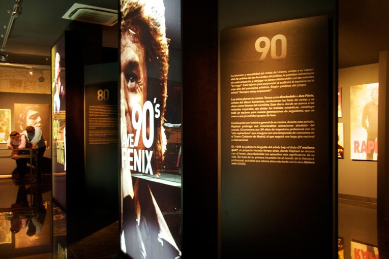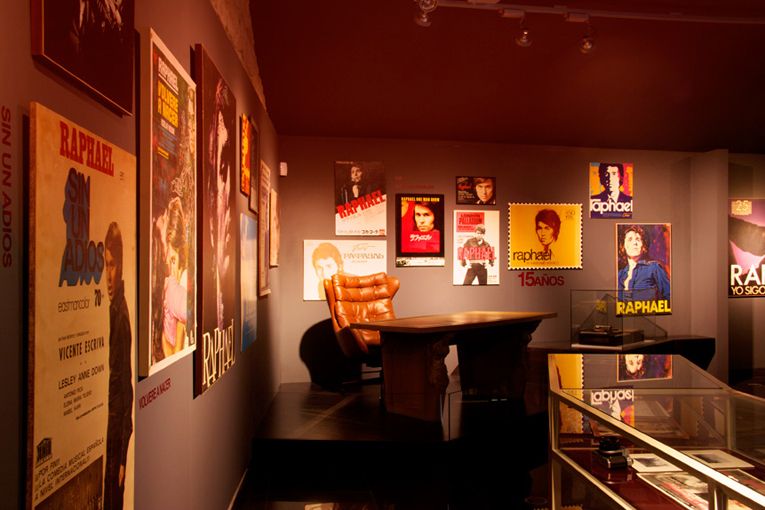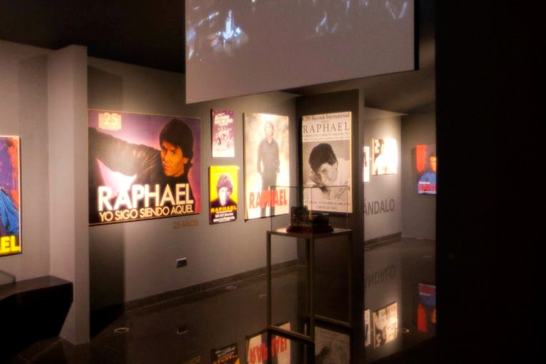 En los 80 están los carteles de su 20 y 25 aniversarios por todo el mundo, incluyendo el Radio City Music Hall de Nueva York; una maqueta del estadio Santiago Bernabeu, donde el artista ofreció un multitudinario y ya casi mítico concierto en 1985.
