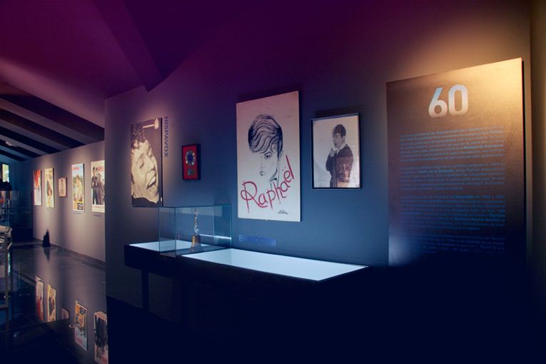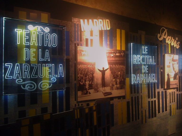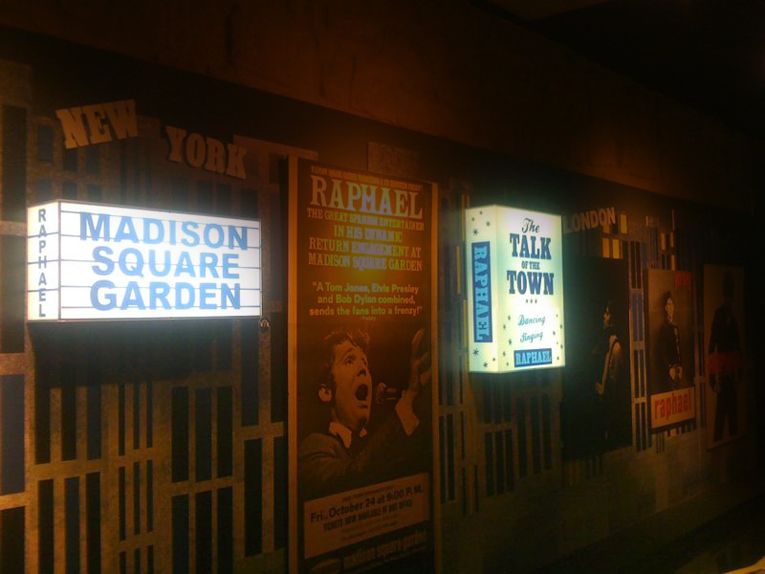 El siguiente espacio es el de la década de los 60, la gran explosión de Raphael. Un pequeño Broadway decorado con grandes neones que simulan las marquesinas de algunos de los teatros de las grandes capitales mundiales que pisó el artista por primera vez, contiene las fotos de sus inicios como profesional; el trofeo conseguido en el Festival de Benidorm de 1962 al mejor intérprete; su primer disco de oro por "La canción del tamborilero", en 1965; carteles originales de sus más emblemáticas actuaciones, como la del Madison Square Garden de Nueva York; los afiches de sus películas; el programa de mano de su histórico concierto en el Olympia de París, y un largo etcétera de documentos muy singulares.